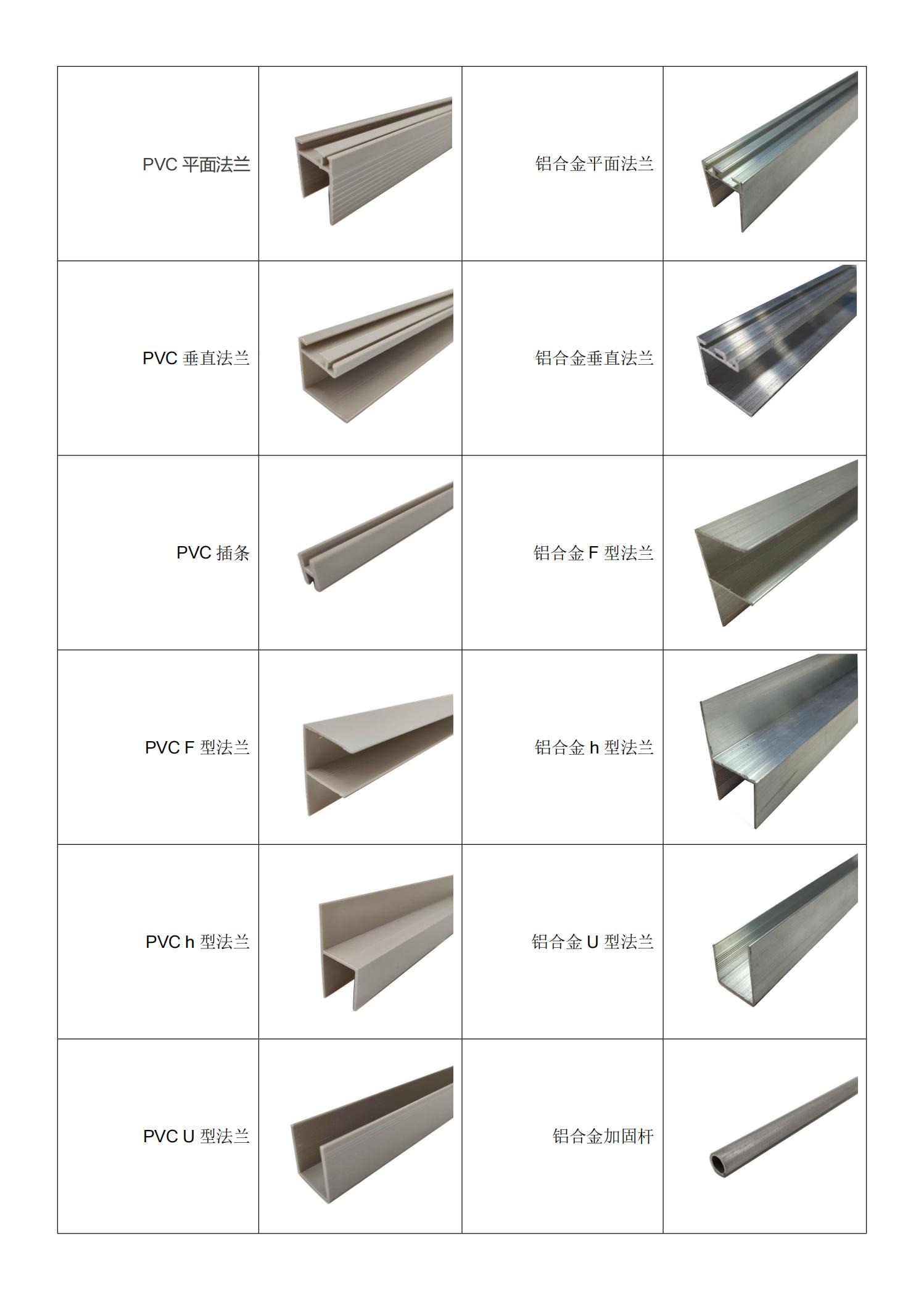 我司供應(yīng)一整套用于復(fù)合風(fēng)管制作安裝相關(guān)的PVC和合金鋁型材。 這些型材用于暖通空調(diào)系統(tǒng)中復(fù)合風(fēng)管的連接,包括平面法蘭、垂直法蘭、U型法蘭、F型法蘭、h型法蘭等。
